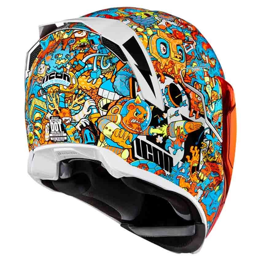 The Icon Airflite Redoodle motorcycle helmet’s ventilation system consists of strategically placed air vents, intakes, air channels and exhaust ports. The oversized chinbar intake enhances airflow, keeping you cool by routing air where you need it most. A decrease of both drag and weight was achieved by sculpting the traditional neckline of the Icon Airflite to avoid jacket or suit interference.