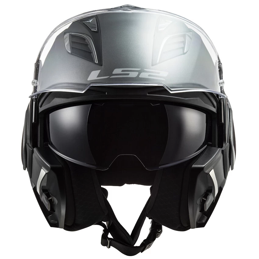 The helmet features multiple intake and exhaust ports ported through the EPS liner for flow-through ventilation. A full metal latch assures the chin bar will stay locked when closed, and an LS2 exclusive design keeps the chin bar securely in place at the back of the helmet when it is in the open position.