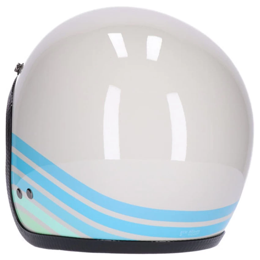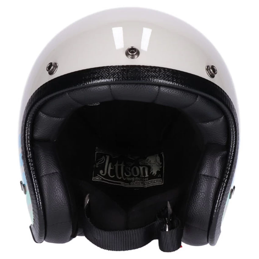 Featuring a classic Double D-ring adjustable chinstrap with Microtechnology fleece padding and premium brass integrated visor/shield snaps. Microtechnology fleece comfort lining with premium synthetic leather detailing for more comfort and classy touch. The Jettson 2.0 Wai open face helmet vintage white is ECE 22.05 approved and is delivered including a removable black peak.