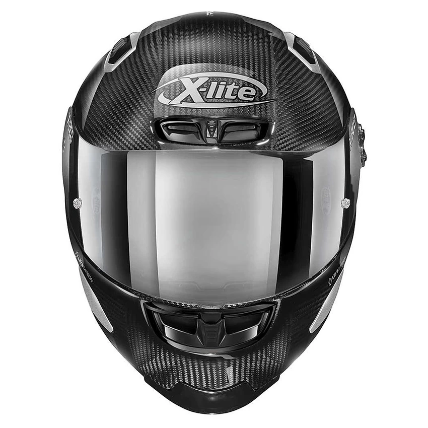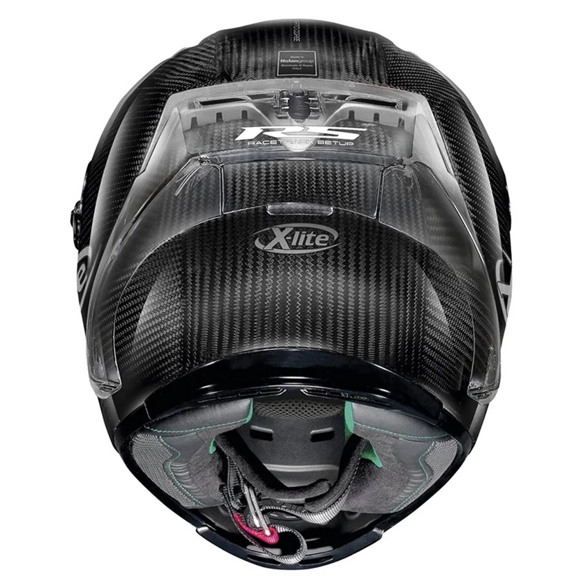 It is the racing full face high-carbon-content helmet by X-lite, here enhanced by an exclusive Racetrack Setup (RS). This is composed of an additional silver visor in the box, the Racetrack Aerodynamic Spoiler (RAS), and an exclusive adjustment system for the position of the liner (LPC – Liner Positioning Control).